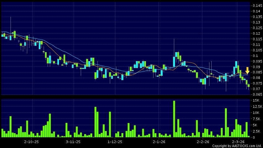 EXTRAWELL PHAR(00858.HK)'s SMA 10 crosses below SMA 20, which is a death cross. Last printed at 0.072; fell 2.703%; on volume of 610.00K shares and turnover of $44.61KRecent Perfor...