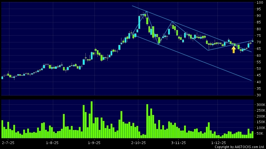 SMIC(00981.HK) appears an upside range breakout. Last printed at 71.050; rose 3.120%; on volume of 69.36M shares and turnover of $4.96BRecent PerformanceIn 3 days: +9.224%In 5 days...