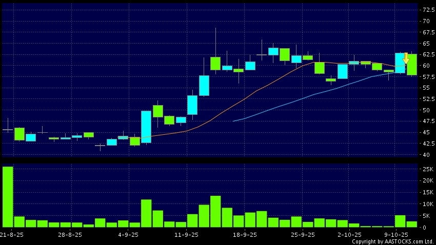 SICC(02631.HK)  -6.250 (-9.960%)   's SMA 10 crosses below SMA 20, which is a death cross. Last printed at 57.800; fell 7.888%; on volume of 2.66M shares and turnover of $158.52M