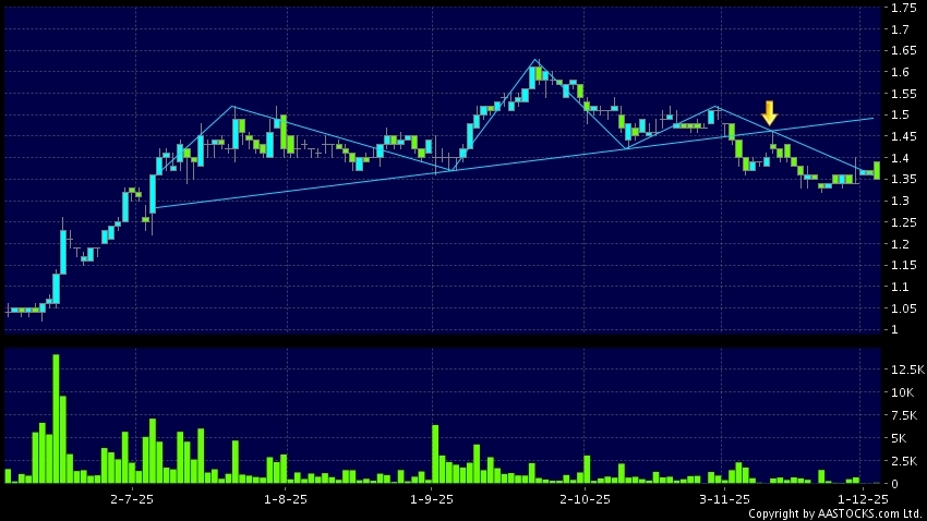 头肩顶是典型的沽出讯号,当股价跌穿支持线(颈线)时,跌势确认股价将持续下跌,技术走势偏软。(港股报价延迟最少十五分钟。)