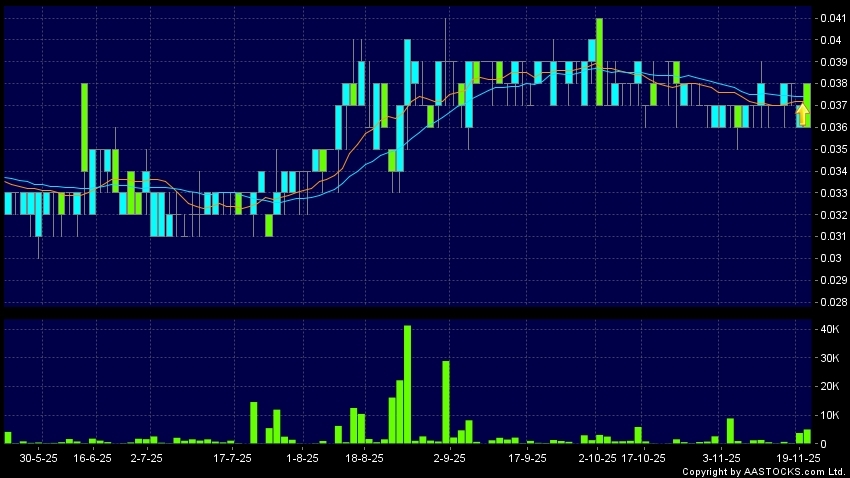 宏安地產(01243.HK) 0.000 (0.000%) 10天移動平均線升穿20天移動平均線,出現黃金交叉。現價報0.036,下跌2.703%,成交量5.03百萬股,成交額19.10萬。