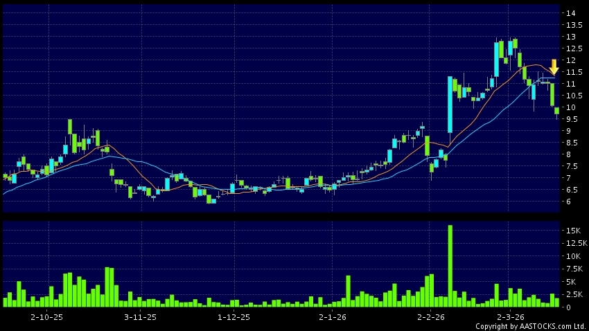 龍資源(01712.HK) +0.100 (+1.011%) 10天移動平均線跌穿20天移動平均線,出現死亡交叉。現價報9.720,下跌3.571%,成交量1.77百萬股,成交額1.70千萬。