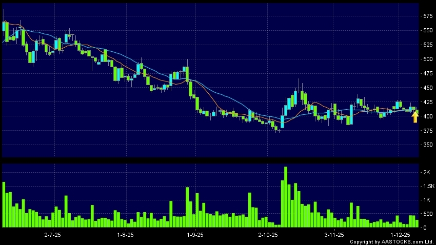 蜜雪集團(02097.HK) +9.200 (+2.284%) 沽空 $3.55百萬; 比率 2.312% 10天移動平均線升穿20天移動平均線,出現黃金交叉。現價報404.400,下跌1.558%,成交量27.91萬股,成交額1.12億。