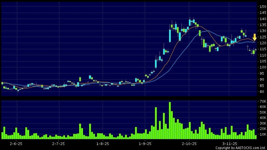 百度集團-SW(09888.HK) -5.900 (-5.180%) 沽空 $3.60億; 比率 23.615% 10天移動平均線跌穿20天移動平均線,出現死亡交叉。現價報114.100,上升2.608%,成交量8.58百萬股,成交額9.76億。